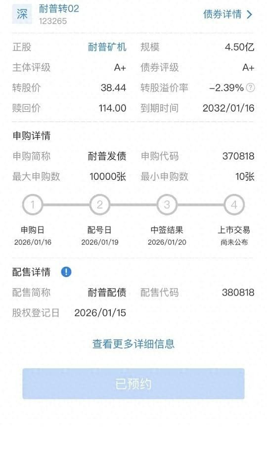 根据发行安排,原股东优先配售日与网上申购日同为2026年1月16日。 原股东优先配售通过深交所交易系统进行,配售代码为“380818”,配售简称为“耐普配债”。社会公众投资者则通过深交所交易系统参与网上申购,申购代码为“370818”,申购简称为“耐普发债”。